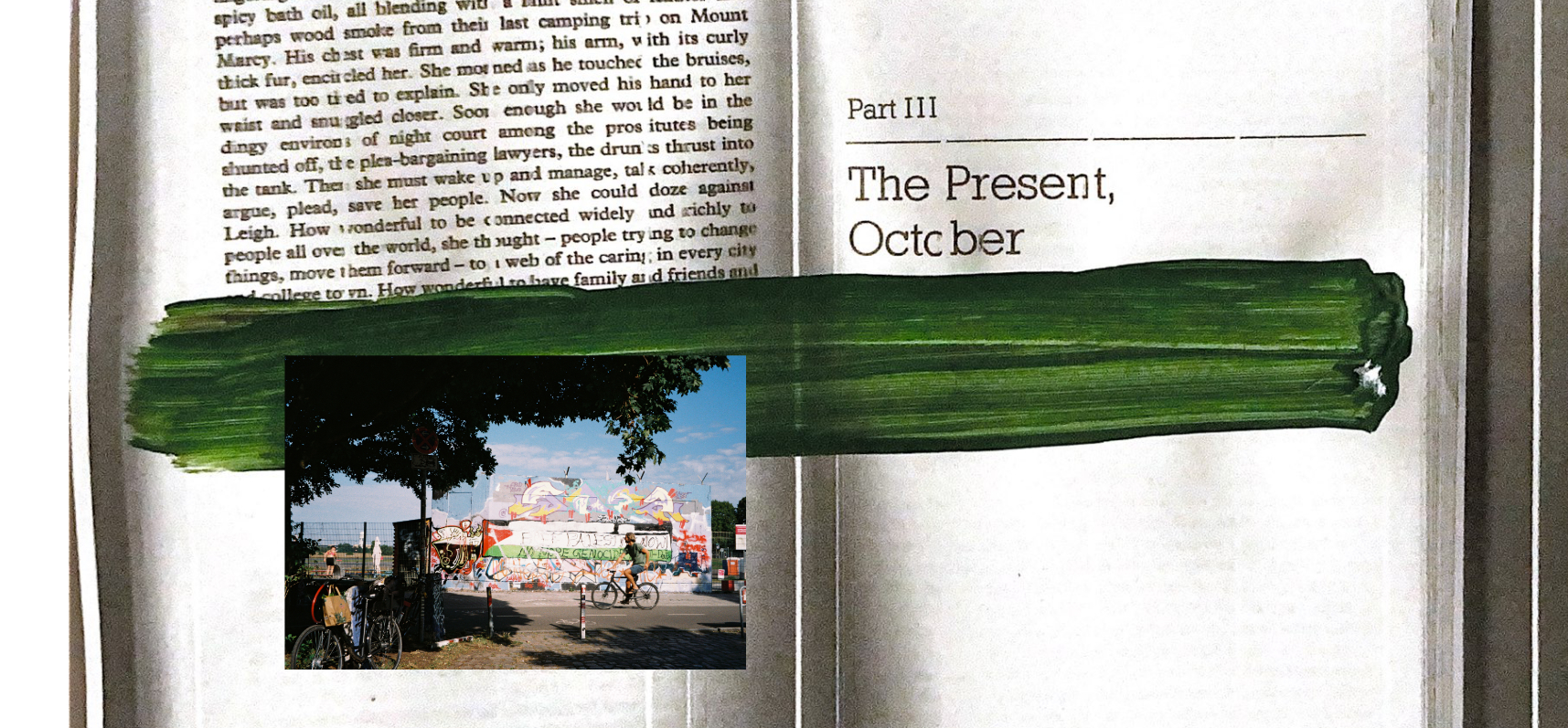 I care about all of it: the end of the genocide, of all the genocides, about racial and climate justice, opening up the borders and keeping them open, keeping fascists out, about queer and trans rights, as well as workers’ rights, about degrowth, feminist economic structures and basic income and animal liberation. I care about all of these things because ultimately, I care about the end of colonization and extractivism.