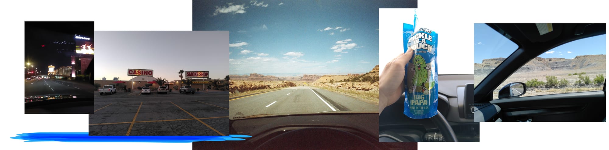 I crossed from Nevada into Arizona and took a 50-minute nap at a gas station as the sun rose. I kept myself awake by calling friends, until I got pulled over on the highway by a cop. It felt like forever while he checked my papers. Eventually, he leaned back through the window: “You’re going to Denver? You’ve never been on this road?”